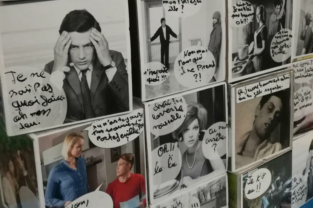 Pour les premières séances nous faisons une initiation au théâtre sous forme de jeux ludiques en axant le travail sur des poses corporelles, des mimiques, des états etc… Ensuite nous faisons un repérage des lieux où les scènes se dérouleront puis nous photographions et imaginons les dialogues.